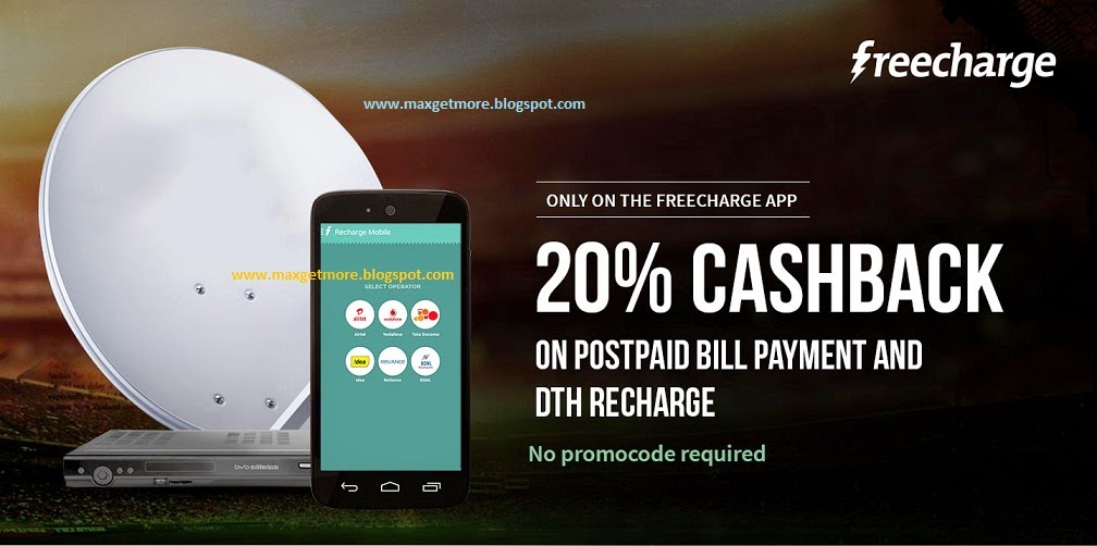 - Get 20% Cashback on Postpaid Mobile Bill payment done only through freeCharge Mobile App (Android/iOS/Windows)
